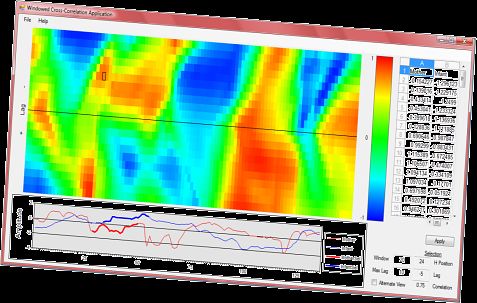 This application implements a windowed cross-correlation technique which can be used to analyze time-series data from two interacting partners (a dyad). It produces a matrix of correlation values. Correlations are calculated within a window of user-specified length. They include the zero-order correlation coefficients of the two time-series along the midpoint of the display. They also include correlations between the previous behavior of one partner and the subsequent behavior of the other partner. These are calculated within a user-specified lag. Area above the plot's midline indicates the correlation of current A codes with successive B codes; area beneath the midline indicates the reverse. (See Usage below.) Measurement software to produce time-series amenable to these analyses is available elsewhere on this website.